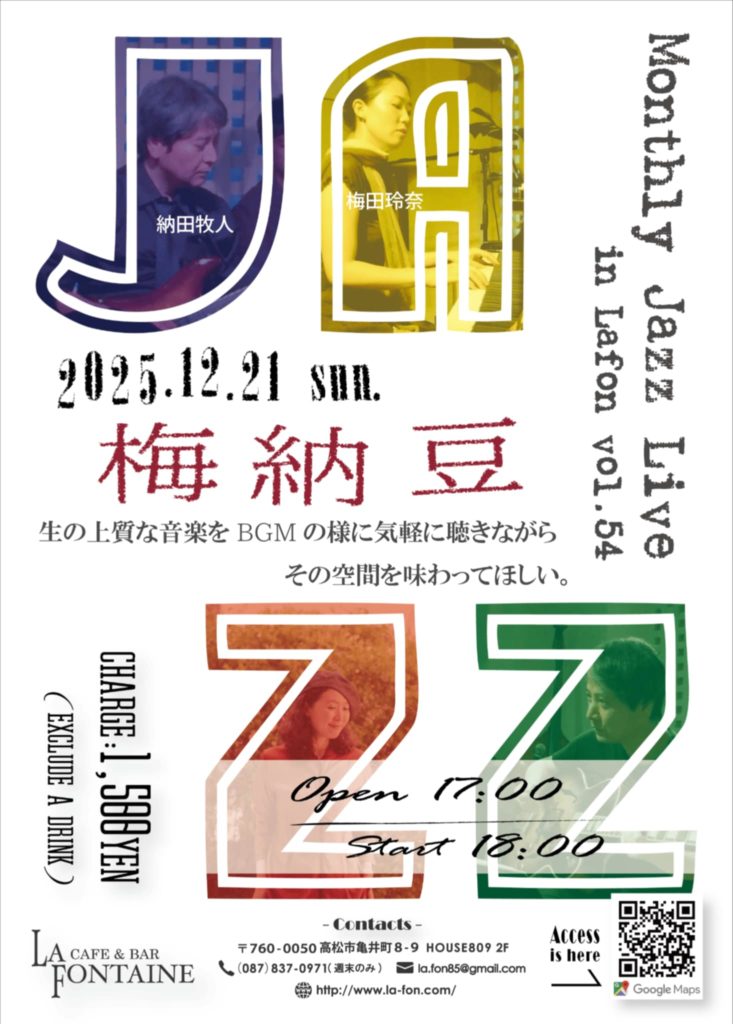 堀剛(Bass)、藤井伸昭(Ds)、納田牧人(Gt)、梅田玲奈(Pf)